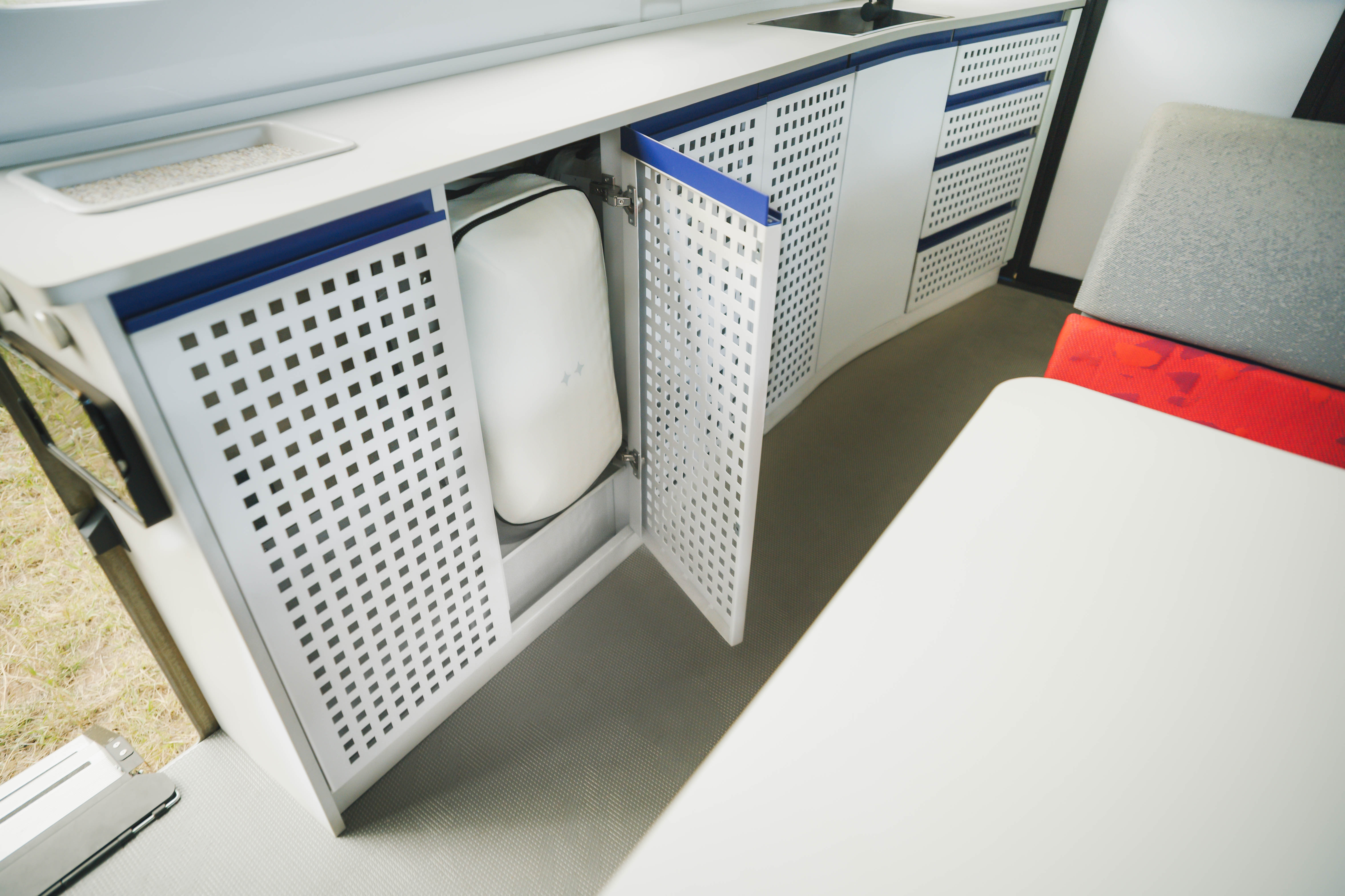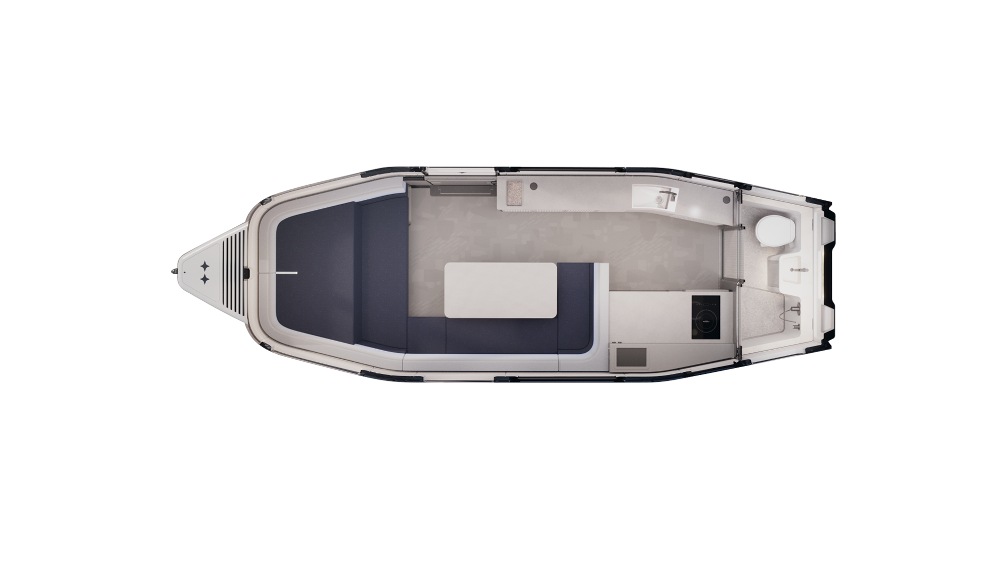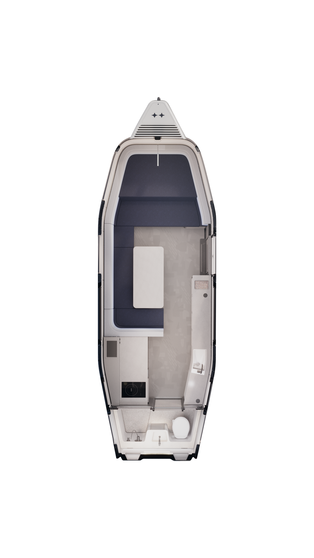 Lowered from the ceiling with a tap on the tablet, this twin bed adds a third sleeping space in seconds. It creates more ways to use the interior for guests, kids, or extended trips, while keeping the cabin open and bright. When not in use, it stows neatly back into the ceiling.