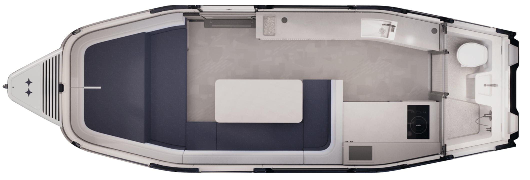Lowered from the ceiling with a tap on the tablet, this twin bed adds a third sleeping space in seconds. It creates more ways to use the interior for guests, kids, or extended trips, while keeping the cabin open and bright. When not in use, it stows neatly back into the ceiling.